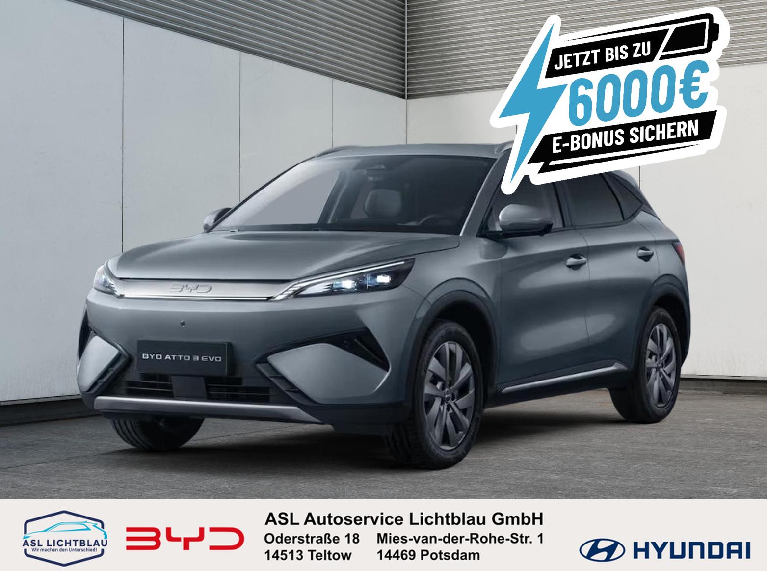 BYD ATTO 3 EVO Design – Jetzt bei ASL Auto-Service Lichtblau in PotsdamDer BYD ATTO 3 EVO Design verbindet modernes SUV-Design mit fortschrittlicher Elektromobilität und hochwertiger Ausstattung. Mit seinem effizienten Elektroantrieb, innovativer Technik und einem stilvollen Interieur bietet er ein komfortables und dynamisches Fahrerlebnis. Die EVO Design-Variante steht für ein besonders hochwertiges Ausstattungsniveau und zeitgemäße Konnektivität.GarantieBasis: 6 Jahre oder 150.000 kmBatterie: 8 Jahre oder 250.000 km (SOH > 70 %)Motor und Steuereinheit: 8 Jahre oder 150.000 kmUnsere Services